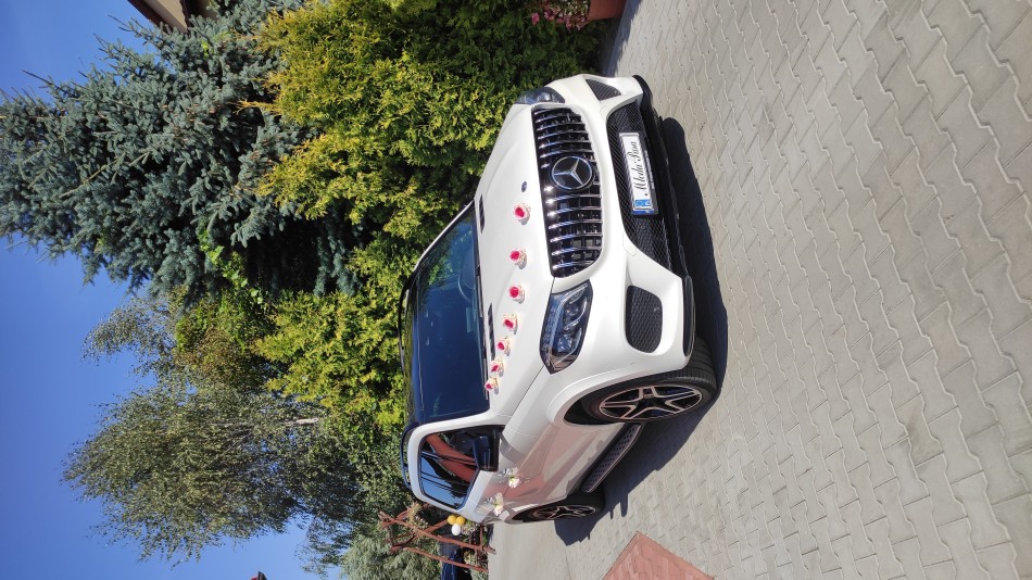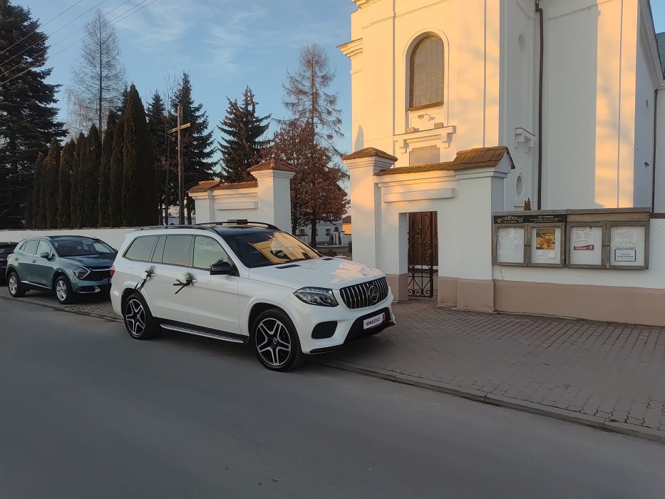 Zawiozę do ślubu, Mercedes GLS pakiet AMG 4MATIC, kolor biały, powłoka ceramiczna, czarny dach panoramiczny, bązowa skóra w środku, pakiet Designo, pełne wyposażenie odnośnie wygody pasażerów, bardzo dużo miejsca, auto siedmio-osobowe. W ramach usługi zapewniam: